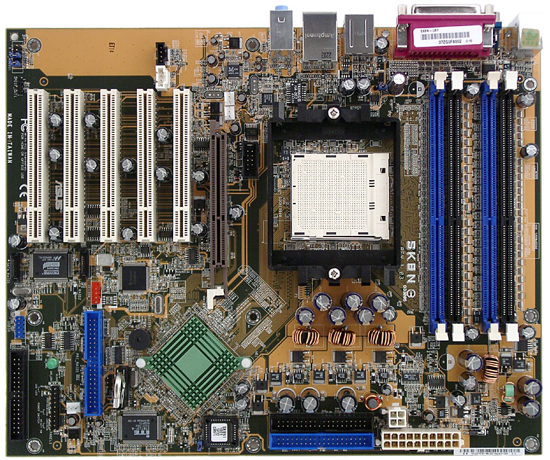 Разводка платы производит несколько странное впечатление: единственный чип nForce3 Pro 150 расположен за слотами PCI, а процессорный сокет и разъемы памяти развернуты на 90°, к тому же участок текстолита перед слотами PCI остался незадействованным. Однако никаких особых неудобств такая разводка не причиняет, лишь кабели от аудиовходов и от разъема IDE RAID могут мешать установке карт расширения, а расположение разъема FDD у самого левого края платы может привести к тому, что кабель от него просто не дотянется до дисковода в достаточно высоком корпусе. Доступ к некоторым из имеющихся перемычек может быть затруднен при установке платы в корпус, краткое описание их функциональности на текстолите платы отсутствует. Наличие напряжения +5 В Standby на плате индицируется зеленым светодиодом. В трехканальном импульсном стабилизаторе напряжения питания процессора применены 6 конденсаторов по 3300 мкФ и 3 по 1200 мкФ. Также на плате находятся стабилизаторы напряжения шины AGP (включающий 2 конденсатора по 1000 мкФ и несколько менее емких) и памяти (3 по 3300 мкФ, усилен применением индуктивных элементов).