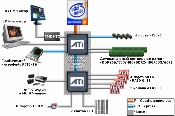 Еще раз отсылаем к представлению ATI Xpress 200, ибо функциональность варианта чипсета для Intel отличается весьма незначительно. Разумеется, интерфейсом для соединения с процессором здесь служит фирменная шина Intel QPB, а контроллер памяти теперь перенесен в чипсет. Также одно небольшое отличие есть в интегрированном видеоядре — пропала поддержка HyperMemory. Действительно, мы так и не увидели ни одной серийной платы на ATI Xpress 200, которая реализовывала бы эту технологию, и это при том, что (исходя из теоретических соображений) системам с процессорами архитектуры AMD64 выделенный буфер кадра нужен куда сильнее, чем платформе Intel Pentium 4. Точные соображения производителей материнских плат по этому поводу нам не известны, но они очевидно «проголосовали ногами». Кроме того, сама идея HyperMemory в первую очередь состояла в экономии электроэнергии для мобильного применения чипсетов ATI: если система простаивает, то процессор может переходить в одно из состояний сна, и его не потребуется будить для дежурного обновления экрана (как раз эта информация и хранится в выделенном буфере кадра).