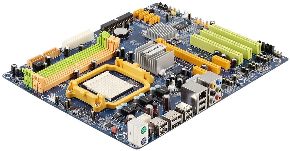 Компоновка традиционная и, в целом, заслуживает похвалы, обращает на себя внимание, положенный «на бок», разъем PATA, расположение разъемов питания у краев платы и, уже ставшие фирменной опцией, кнопки для включения и перезапуска. Шлейфы к SATA-разъемам удобно подключать, даже если в графический порт установлена громоздкая карта, а вот перемычка для очистки CMOS может в таком случае оказаться труднодоступной. Многим понравится наличие 3 PCI-портов, воспользоваться которыми не помешает видеокарта с двухслотовой системой охлаждения. Инженеры Biostar по-прежнему считают FireWire-контроллер необязательной комплектацией плат на недорогих дискретных чипсетах (и, как мы выяснили, анализируя рынок подобных плат, такого же мнения придерживается большинство производителей). Однако, как и ECS в своей A770M-A, Biostar решила, что внешние SATA-порты уже могут быть полезны многим, установив пару на задней панели. Характерно, что на задней панели вовсе не осталось разъемов старого образца, однако на плате сохранена возможность вывести с помощью внешних планок и LPT, и COM, также не стали разработчики лишать пользователя возможности подключить флоппи-дисковод.