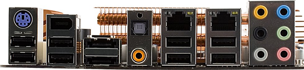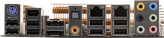Обращает на себя внимание набор портов на задней панели платы: там помногу всего, и место не пропадает зря, как на многих моделях, где половина отведенного для задней панели пространства пустует, потому что там вроде как организовано вентиляционное отверстие. Хочется искренне удивиться уверенности производителей, что их 400-долларовую плату установят в дрянной маленький корпус, которому будет жизненно необходима лишняя вентиляционная щель. В данном же случае остается пожелать разве что кнопку для сброса CMOS, но и то она интересна лишь заядлым оверклокерам, а простые пользователи с большей благодарностью примут имеющиеся 8 портов USB, два типа S/PDIF-Out, 2 eSATA и т. д.