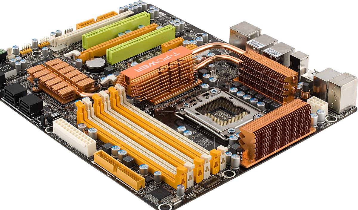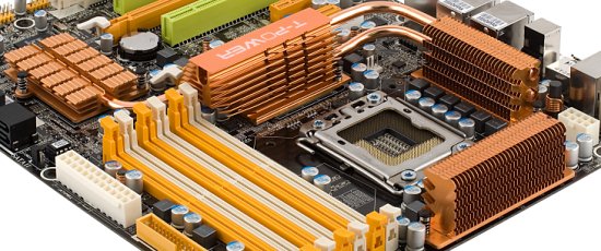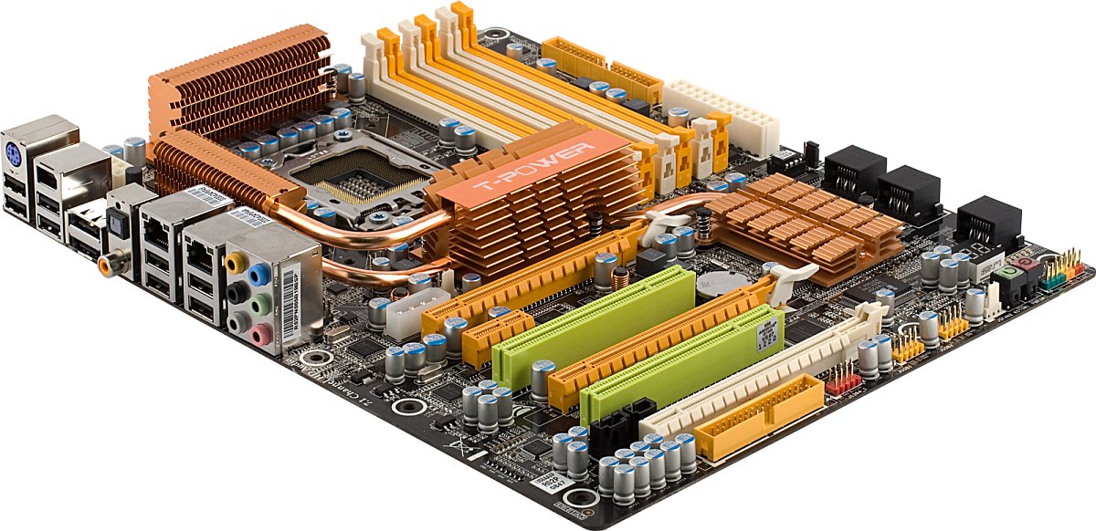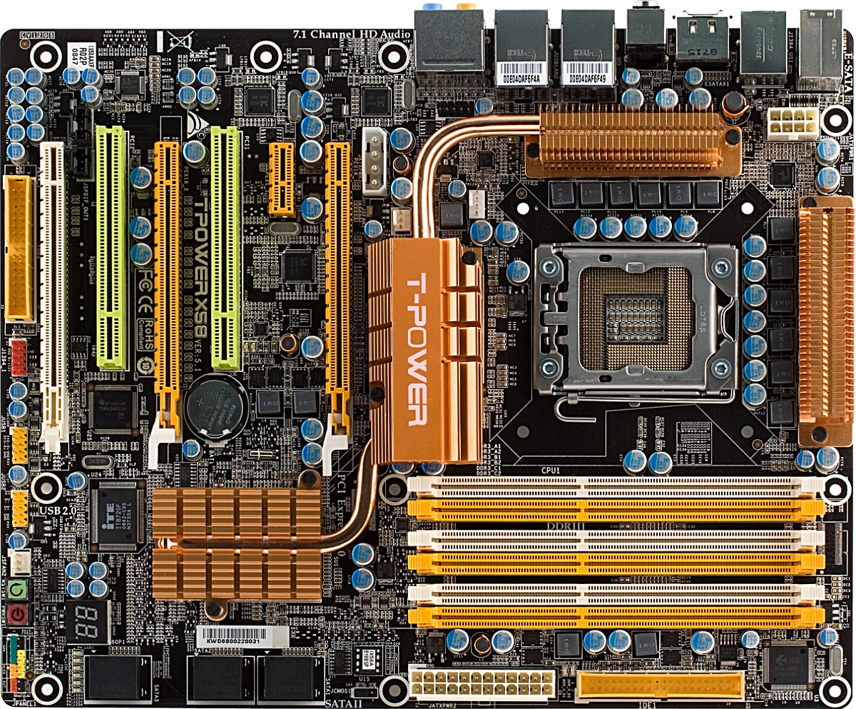 Первоначальному знакомству с особенностями платы помешали многочисленные наклейки рекламного характера, которые пришлось долго отскребать от слотов и разъемов. Согласитесь, будет не слишком приятно, если в результате долгого расследования выяснится, что причина странных сбоев в работе модуля памяти — застрявший в щели разъема кусочек бумажки. В данном случае с прилипчивостью наклеек в компании явно переборщили. Зато по завершении процесса очистки плата порадовала нас грамотной разводкой, где все разъемы на своих местах и удобны для подключения. Поскольку TPower X58 поддерживает SLI (и, конечно, CrossFireX), мы ожидаемо видим два слота PCIEx16 (и даже третий такого же форм-фактора, но у него лишь 4 линии PCI-E 2.0), а количество слотов PCI ограничено теми же двумя. Также отметим дополнительный разъем питания (4-контактный периферийный) для слотов PCIEx16 — его можно подключить коннектором от БП, чтобы повысить стабильность работы видеоускорителей.