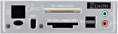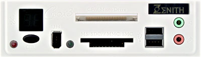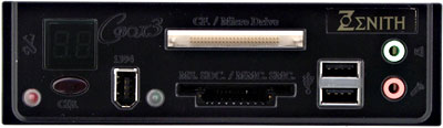 - Панель CBOX3 с инфракрасным приемником, 2 разъемами USB 2.0, Audio-In/Out, 1 портом FireWire, 2 семисегментными светодиодными индикаторами, отображающими процесс прохождения процедуры POST, а позже — температуру процессора, а также считывателем флеш-карт форматов CF, MMC, MS, SMC, SD;