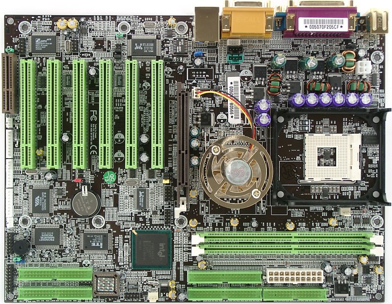 Краткие характеристики платы: разъемы памяти 2 DDR SDRAM; слоты расширения AGP/ 6 PCI/ CNR; порты ввода/вывода 2 COM/ LPT/ 2 PS/2/ 3 FireWire/ 6 USB 2.0; размеры 305х230 мм.