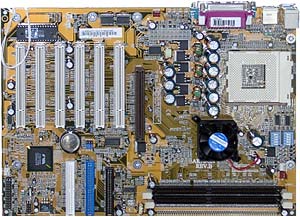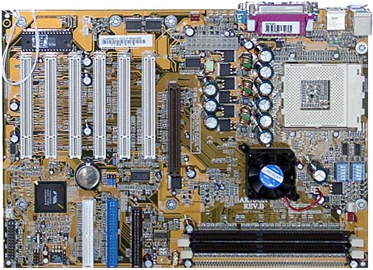 Процессорный разъем расположен весьма удачно. Он не только развернут к кромке платы той стороной, на которой защелкиваются кулеры, но и подвинут вплотную к краю. Продуманное расположение конденсаторов на достаточном удалении от Socket-A позволит без труда установить любой кулер.