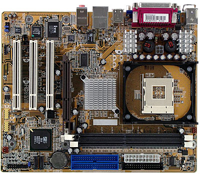 Трудно ожидать, чтобы плата форм-фактора mATX обладала удобной разводкой, а уж когда ее размеры уменьшены даже относительно этого стандарта, то тут вылезают все возможные огрехи. В итоге различные разъемы расположены слишком близко друг к другу, и многие из них вам придется подключать, предварительно освобождая соседние или вовсе вынимая плату из корпуса однако будучи собранной, система проблем вам не доставит. Зато доступ к единственной имеющейся перемычке (для сброса CMOS) не затруднен даже при установке платы в корпус, и ее краткое описание приведено на текстолите платы. В двухканальном импульсном стабилизаторе напряжения питания процессора применены 12 конденсаторов по 1500 мкФ, полевые транзисторы в этой цепи прикрыты маленькими радиаторами для улучшения теплового режима. Также на плате находятся стабилизаторы напряжения шины AGP (включающий 2 конденсатора по 1000 мкФ) и памяти (2 по 1000 мкФ).