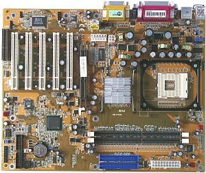 Краткие характеристики платы: разъемы памяти — 2 DDR SDRAM; слоты расширения — AGP/ 5 PCI/ CNR; порты ввода/вывода — 2 COM/ LPT/ 2 PS/2/ 4 USB 1.1; размеры платы — 305х245 мм.