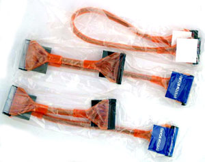 -  Кабели: 2 Serial ATA (без переходников питания), 2 ATA66/100/133 и шлейф для подключения дисковода  последние экранированы и убраны в прозрачный оранжевый кембрик;