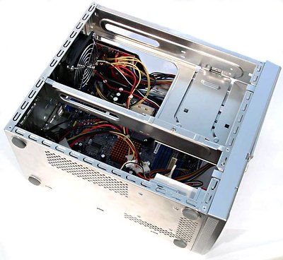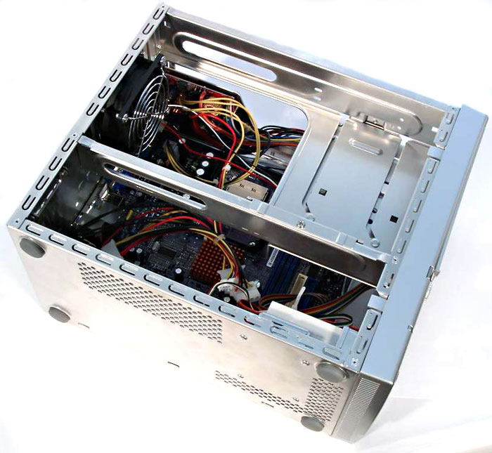 После снятия крышки видим вертикальный отсек для установки CD/DVD-привода, внушительный кулер на задней стенке и смонтированную на боковой стенке материнскую плату с путаницей проводов. Отсек для 5-дюймовых устройств, как можно было понять еще по внешнему виду, у EZ-Buddie один, да и для 3-дюймовых устройств тоже предусмотрено всего одно место. Это, несомненно, огорчит многих энтузиастов, но для большинства рабочих компьютеров сочетание 1 HDD + 1 CDD совершенно естественно, а при своей цене модель ECS позиционируется именно в качестве нормального рабочего инструмента. Зато энтузиастов наверняка порадует совершенно экстремальный способ установки винчестера: он помещается в съемную корзину, крепится в ней винтами, затем эта корзина в вертикальном положении вдвигается сверху в щель между стойкой для крепления дисковода и материнской платой на противоположной стенке, причем выступы на «днище» корзины входят в специальные пазы (узкие вертикальные прорези, хорошо различимые на фотографии выше), и в заключение один винт скрепляет получившуюся конструкцию воедино. В принципе, выполняется это не так сложно, как описывается, да и подключение кабелей снизу к установленному винчестеру происходит довольно удобно, но все же желательно, чтобы при выполнении этой операции CD-привод был снят. К тому же остается открытым вопрос о влиянии работы в вертикальном положении на здоровье жесткого диска.