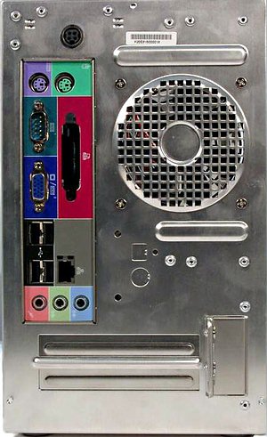На алюминиевой крышке корпуса нет решительно ничего интересного, даже вентиляционных отверстий (они расположены на дне, так что не вздумайте снимать ножки), а на задней панели представлен вполне обычный и в какой-то степени даже устаревший набор разъемов. FireWire отсутствует, «видео-» (TV-Out, DVI) и «аудионавороты» (S/PDIF) тоже, зато в наличии 2 PS/2, 1 LPT, 1 COM, 1 VGA, 1 LAN, 4 USB (2.0) и 3 Audio. Ну а компенсировать нехватку встроенных мультимедийных возможностей вам помогут две карты расширения, под выход которых на задней панели есть место.