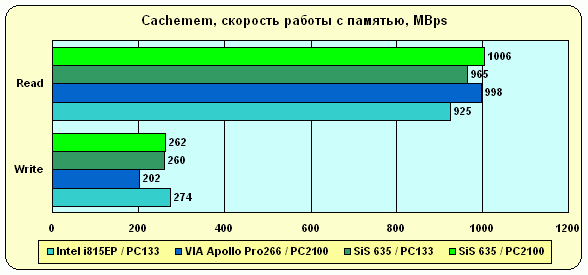 Результаты синтетического теста Cachemem — это "пиковые" значения скорости работы с ОЗУ. К этому тесту вряд ли стоит относиться как к инструменту оценки реальной производительности в приложениях, ценность его в другом — он позволяет выявить наиболее "слабые" места в организации работы с памятью в каждом чипсете, и именно этим может быть интересен.