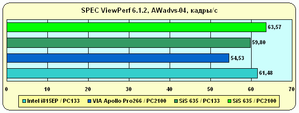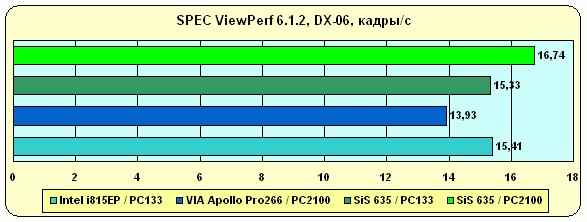 Также запускался тестовый пакет SPEC ViewPerf, который эмулирует работу приложений, использующих профессиональный OpenGL. Мы уже не раз имели возможность убедиться, что ViewPerf очень "чутко" реагирует на производительность подсистемы памяти, поэтому применение этого пакета для оценки производительности данной подсистемы в разных чипсетах вполне оправдано и весьма информативно.