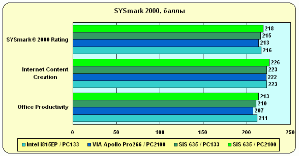 Разница между участниками теста, в принципе, минимальна. Однако общая тенденция, тем не менее, прослеживается: SiS 635 в комбинации с PC2100 DDR SDRAM — абсолютный чемпион "забега", с памятью PC133 он же оказался уже на третьем месте (уступив всего один балл i815EP с такой же памятью), ну а медленнее всех была материнская плата на чипсете VIA Apollo Pro266, причем ей не помогло даже использование DDR-памяти.