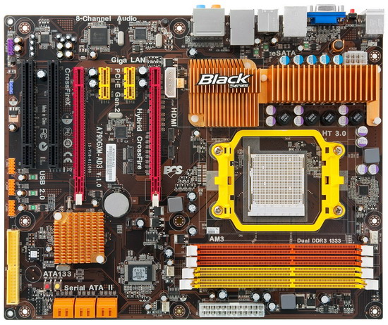 Плата основана на чипсете AMD 790GX (северный мост AMD 790GX и южный SB750), о возможностях которого вы можете узнать из обзорной статьи по ссылке. Для подключения накопителей установлено 6 внутренних портов SATA/300 (диски, подключенные к ним, могут объединяться в режимах RAID 0, 1, 0+1 и 5), а также внешний порт eSATA/300. Также, как и на всех платах на современных чипсетах под AMD-платформу, имеется чипсетный канал IDE с поддержкой 2 накопителей PATA/133.