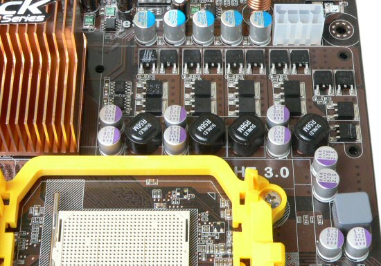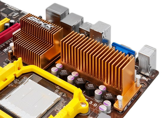 Стабилизатор напряжения питания 5-канальный (4 канала питают процессорные ядра и еще один канал отвечает за питание CPU NB), во всех каналах установлено по 4 полевых транзистора. Установлены 10 конденсаторов по 820 мкФ и 5 — по 270 мкФ, все конденсаторы фирменные, твердотельные. Добротная классическая схема, вдобавок покрытая внушительных размеров радиатором призвана обеспечить питание процессоров с заявленным TDP до 140 Вт. Ну а поскольку максимальное TDP наиболее ходовых на сегодняшний день процессоров находится в диапазоне 95-125 Вт, очевидно что плата обеспечит и запас на случай разгона.