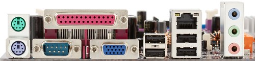 Количество элементов, которые на плате отсутствуют, но предусмотрены разводкой, явно превышает количество установленных, в их числе — две разновидности сетевых контроллеров (самостоятельный и PHY), FireWire, 7.1-канальный аудиокодек, два порта SATA и дополнительный USB, разъем для модуля TPM и т.п. В трехканальном импульсном стабилизаторе напряжения питания процессора применены по 3 полевых транзистора на канал (но и здесь не обошлось без «запаса на будущее» — разводкой предусмотрено по 4) и 9 конденсаторов по 1800 мкФ. Использованы конденсаторы неопознанного нами производителя, но явно не ведущих марок. Размер платы — 245?225 мм (усеченный microATX), крепление к корпусу шестью винтами, правый край на уровне разъемов для накопителей остается незакрепленным.