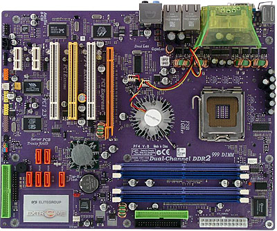 Несмотря на функциональную насыщенность платы, ее разводка производит исключительно благоприятное впечатление: слоты PCIEx1 занимают так мало места (по сравнению с классическими PCI), что все компоненты расположены грамотно, и даже вечная проблема аудиовходы отнесены от задней стенки к нижнему краю платы. Ну разве что вставленная видеокарта будет блокировать модули памяти в разъемах. Доступ к единственной имеющейся перемычке не затруднен даже при установке платы в корпус, краткое описание ее функциональности на текстолите платы отсутствует. Наличие напряжения на разъемах для модулей памяти индицируется оранжевым светодиодом, при установке видеокарты PCIEx16 загорается голубой светодиод, при ее отсутствии желтый, а наличие карт расширения в слотах PCI и PCIEx1 индицируется погашенными светодиодами (при их отсутствии они «моргают»). В четырехканальном импульсном стабилизаторе напряжения питания процессора применены 14 конденсаторов по 1800 мкФ. Также на плате находятся стабилизаторы напряжения шины PCIEx16 (включающий 4 конденсатора по 1000 мкФ, усилен применением индуктивных элементов) и памяти (6 по 1000 мкФ, усилен применением индуктивных элементов). Радиаторы причудливых форм на обоих мостах чипсета выглядят забавно, но безобидно, а вот вентилятор в кулере северного моста и оригинальное техническое решение вентилятор с раструбом на задней панели (охлаждает цепи стабилизаторов) акустического комфорта не добавляют.