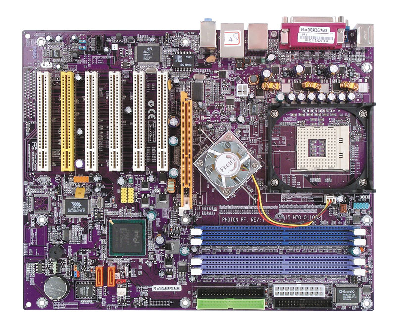 Разводка платы очень удобна, из недостатков можно отметить разве что привычное расположение звуковых разъемов перед слотами PCI, да блокировку модулей памяти в разъемах при вставленной видеокарте. Доступ к имеющимся перемычкам не затруднен даже при установке платы в корпус, краткое описание их функциональности приведено на текстолите платы. В трехканальном импульсном стабилизаторе напряжения питания процессора применены 7 конденсаторов по 1500 мкФ и 3 по 2200 мкФ. Также на плате находятся стабилизаторы напряжения шины AGP (включающий 1 конденсатор на 1500 мкФ и несколько менее емких) и памяти (1 по 1500 мкФ и несколько менее емких).