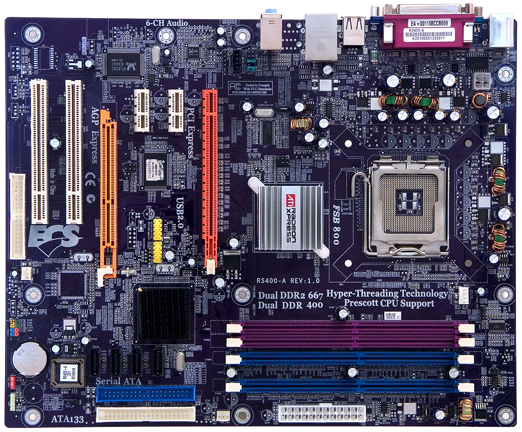 ECS RS400-A — плата, которая разрабатывалась специально для плавного и как можно более дешевого перехода к новым стандартам домашних и офисных ПК, и которая, надо сказать, вполне справляется с этой возложенной на нее задачей. Повторимся, что использовать ее для чего-то большего мы не рекомендуем. Единственным однозначным плюсом данной модели является неплохая интегрированная графика чипсета ATI Radeon Xpress 200, минусом — производительность при использовании внешнего видеоускорителя. Скудные функциональность и комплектация — это разумный компромисс ради снижения стоимости. Оригинальный дизайн платы позволяет без проблем применять любой из двух типов памяти, а вот за возможность использования AGP-видеокарты приходится платить снижением скорости.