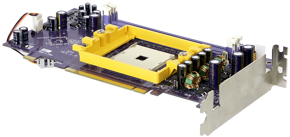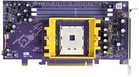 На самом деле все, что было сказано о ECS SIMA A9S, относится и к рассматриваемой сегодня плате. A4S устанавливается в слот Elite BUS (PCIE x16 + PCIE x1), и предназначена для расширения возможностей платы PF88 Extreme Hybrid, а именно, для установки на эту плату процессоров под Socket 754. Соответственно своему предназначению ECS SIMA A4S оснащена упомянутым выше процессорным сокетом, двумя разъемами для модулей памяти (работают в одноканальном режиме) и 4-контактным разъемом ATX12V для питания процессора. Никаких интегрированных контроллеров, разумеется, нет (да они здесь и не нужны). Все необходимое находится на основной плате. Северный мост SiS756 так же, как и у A9S, находится на задней стороне карточки, но место радиатора на нём занимает кулер. На этом различия между A9S и A4S заканчиваются.