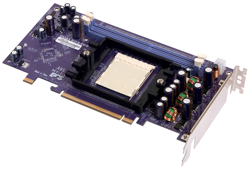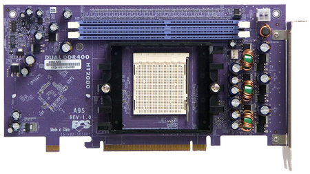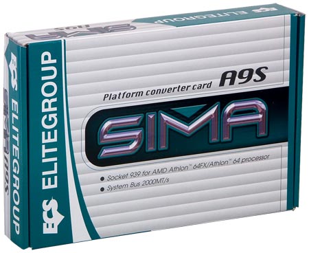Саму материнскую плату ECS PF88 Extreme Hybrid мы уже рассматривали, теперь настало время ECS SIMA A9S. Как раз вместе с этой карточкой расширения PF88 и составляет «экстремальный гибрид». Основной задачей A9S является поддержка процессоров AMD, и поэтому на ней нет ничего кроме сокета 939, разъёмов под модули системной памяти (2 DDR SDRAM DIMM) и 4х-контактный ATX для питания процессора. Так же на плате находится набор системной логики (северный мост) SiS 756, работающий с южным мостом SiS956 на ECS PF88. Всего этого вполне достаточно для обеспечения взаимодействия между A9S и PF88 Extreme Hybrid. Стоит отметить, что ECS A9S подключается к слоту Elite BUS на основной плате, а переключение между процессорами Intel и AMD происходит с помощью перемычек, находящихся рядом с упомянутым выше слотом.