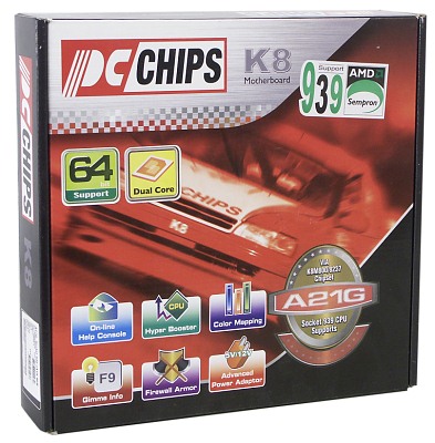 - Компактная коробка с напечатанными уверениями в равной поддержке как процессоров Sempron для Socket 939, так и «двухъядерников», а также значками фирменных технологий, встречающихся на других платах под маркой ECS/PCChips, но к данной плате отношения не имеющих;