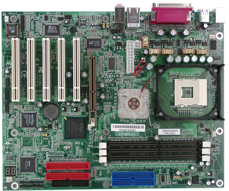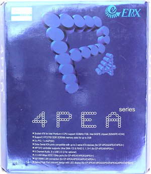Плата не является топовой в линейке EPoX на i845PE, а потому на фоне продукции конкурентов выглядит средне, явно выделяясь лишь светящимся благодаря полупрозрачному пластику и синим светодиодам кулером на чипсете. К нам в руки попал предсерийный экземпляр платы.