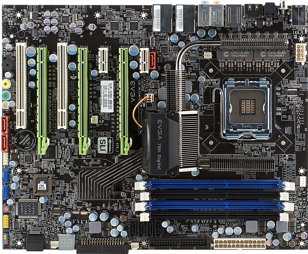 Сегодня мы кратко рассмотрим новую плату, причем это как раз тот случай, когда полный обзор, с детальной фиксацией всех возможностей, особенностей комплектации и пр., просто не нужен. Дело в том, что плата продается компанией EVGA, и уже из этого факта наши внимательные читатели сразу могут сделать правильный вывод, что речь не идет о какой-то совершенно новой модели, и даже могут правильно угадать имя реального производителя и разработчика. Напомним, что полгода назад мы рассматривали две идентичные (с точностью до надписей на наклейках и оформления коробок, а также комплекта поставки) платы, основанные на чипсете NVIDIA nForce 790i Ultra SLI. Те модели были предоставлены нам компаниями XFX и Zotac, и брать в таких условиях третью точно такую же плату, но с надписью EVGA на кулере, было явно излишне — обзор референсной платы NVIDIA от этого ничего бы не приобрел.