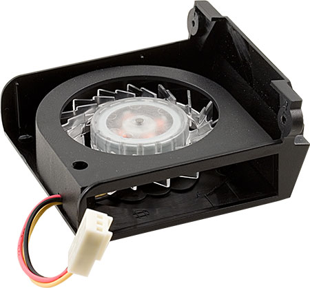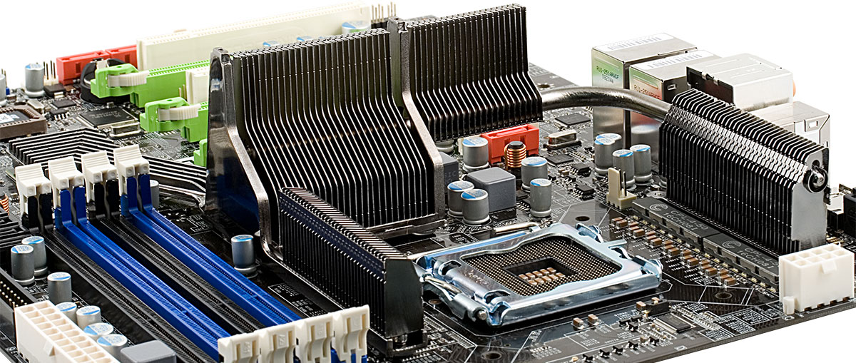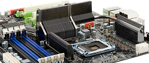 Система охлаждения на плате немного упрощена по сравнению с «аналоговой» версией платы на nForce 790i [Ultra] SLI: она лишилась одного радиатора (на отсутствующей теперь части полевых транзисторов), а второй стал немного меньше. К сожалению, применение цифрового конвертера питания процессора не влияет на тепловыделение чипсета, так что все элементы системы охлаждения по-прежнему греются очень сильно! Зато крепятся все радиаторы не к плате пластиковыми защелками, а нормальными металлическими винтами с оборотной стороны текстолита, так что при необходимости очень легко заменить термопасту или усилить прижим к охлаждаемым микросхемам. На радиатор северного моста по-прежнему крепится кулер, хотя он свой вид немного поменял (еще у EVGA nForce 790i SLI FTW): теперь с одного из торцов он закрыт кожухом, вентилятор заменен на радиальный, а вывод воздуха организован через щель сбоку. Сложно сказать, повысилась ли от этого эффективность охлаждения, но работает новый вентилятор немного тише.