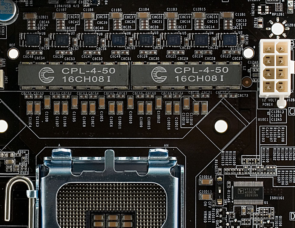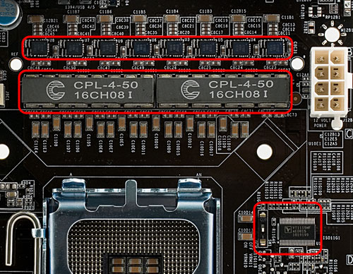 Во-вторых, цифровой ШИМ-контроллер может работать на существенно более высокой частоте, обеспечивая более тонкую регулировку и повышенную стабильность выдаваемого напряжения при значительно меньшем рассеянии тепла. Действительно, пульсация выходного напряжения столь невелика, что вместо привычных емких электролитических конденсаторов (в большинстве сегодняшних топовых моделей применяются экземпляры даже с твердым полимерным электролитом), плата EVGA ограничивается использованием керамических SMD-конденсаторов малой емкости. Заодно отметим и использование обычно применяемых в связке с силовыми модулями Volterra дросселей Coiltronics CPL-4-50 (объединяющих 4 индуктивности в одном низкопрофильном корпусе с ферритовым сердечником). В итоге пространство вокруг процессорного сокета максимально свободно (и это при 8-канальном стабилизаторе!), что позволяет установить практически любые кулеры, добиваясь наибольшего эффекта в охлаждении процессора.