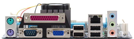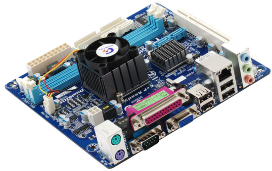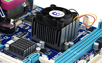 В отличие от многих производителей, ограничивающих системы на Atom пассивным охлаждением, в Gigabyte решили перестраховаться и установили на процессор «полноценный» кулер с вентилятором. Обратите внимание, что, в противоположность некоторым представителям предыдущего поколения, вентилятор вернулся на свое законное место: чипсет здесь рассеивает всего до 2 Вт энергии, так что мог бы обойтись вообще без радиаторов. Впрочем, инженеры Gigabyte на всякий случай снабдили его этим элементом — хуже точно не будет. По-видимому, так же можно было поступить и с процессором, ведь и его тепловыделение менее 10-13 Вт. Однако ассортимент корпусов Mini-ITX очень велик, не все из них снабжены хоть какой-нибудь системой активной вентиляции, так что маленький вентилятор может оказаться нелишним. Если же пользователь решит, что ему он не нужен, достаточно просто открутить четыре винтика. Аналогично, если предложенный вариант будет воспринят как недостаточно эффективный или излишне шумный (на что жалобы есть — без дополнительного продува корпуса вентилятор разгоняется до 4000 оборотов, удерживая температуру процессора на уровне 40-45 градусов под нагрузкой, но шум от него при таком раскладе становится ощутимым, пусть и не чрезмерным), его можно заменить: вентиляторов с диаметром крыльчатки 40 мм на рынке немало. Или даже совершить ту же операцию с кулером целиком, благо его схема крепления весьма лояльна к подобным процедурам: используется надежная и привычная по многим старым (и не очень) видеокартам схема с винтовым крепежом и использованием задней пластины «из угла в угол».