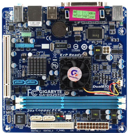Поскольку Pine Trail поддерживает всего два порта SATA (чего может оказаться недостаточно для домашнего NAS) и вовсе не поддерживает РАТА (а вот это уже может привести к затруднениям в офисе — при попытке переставить CD-ROM или винчестер со старого компьютера), в Gigabyte решили несколько помочь чипсету, установив на плату привычный по другим моделям контроллер «Gigabyte SATA 2». Аналогичным образом обошлись и с сетью — чипсет поддерживает максимум 100 Мбит/с, поэтому плата обзавелась и дополнительным гигабитным контроллером. В принципе, оставшихся двух линий PCIe хватает, чтобы установить хотя бы один слот этого стандарта, однако в компании рассудили чуть по-другому, сделав выбор для единственного слота в пользу PCI. Что ж, несмотря на то, что сейчас ассортимент плат расширения для этих шин можно считать уже примерно равным, а некоторые интересные адаптеры (например, USB 3.0) встречаются только в исполнении под PCIe, поддержка «устаревшего» стандарта имеет то преимущество, что позволяет продолжать эксплуатировать «устаревшие» же (но, тем не менее, справляющиеся со своими обязанностями) платы расширения. Впрочем, есть вообще серьезные подозрения, что в большинстве инсталляций этот слот будет пустовать.