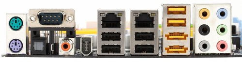 За набор и компоновку разъемов задней панели плата заслуживает самых высоких оценок: есть все современные периферийные интерфейсы, и при этом их соотношение сбалансировано. Несколько удивляет, что установленные в едином блоке разъемы eSATA и USB выкрашены в единый же желтый цвет, что может сбить с толку неопытного пользователя, так как обычно (да и в паре сантиметров левее) порты USB черные.