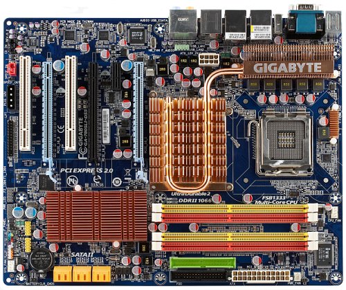 Импульсный стабилизатор напряжения питания процессора организован по 6-канальной схеме, использует по 2 полевых транзистора на канал, а все конденсаторы на плате, как это уже стало традицией у дорогих моделей, только высококачественные полимерные (в данном случае — от Fujitsu из серии FPCAP), с низким ESR. Размер платы — 305×245 мм (полноразмерный ATX), крепление осуществляется при помощи 9 стандартных винтов, все углы жестко зафиксированы. Пока у нас нет сведений о других моделях Gigabyte на базе 780i/750i SLI, так что мы не можем сказать, будут ли у платы «сестры» на том же или близком дизайне PCB, а вот еще более дорогую модель из серии DQ6 ждать, в принципе, можно.