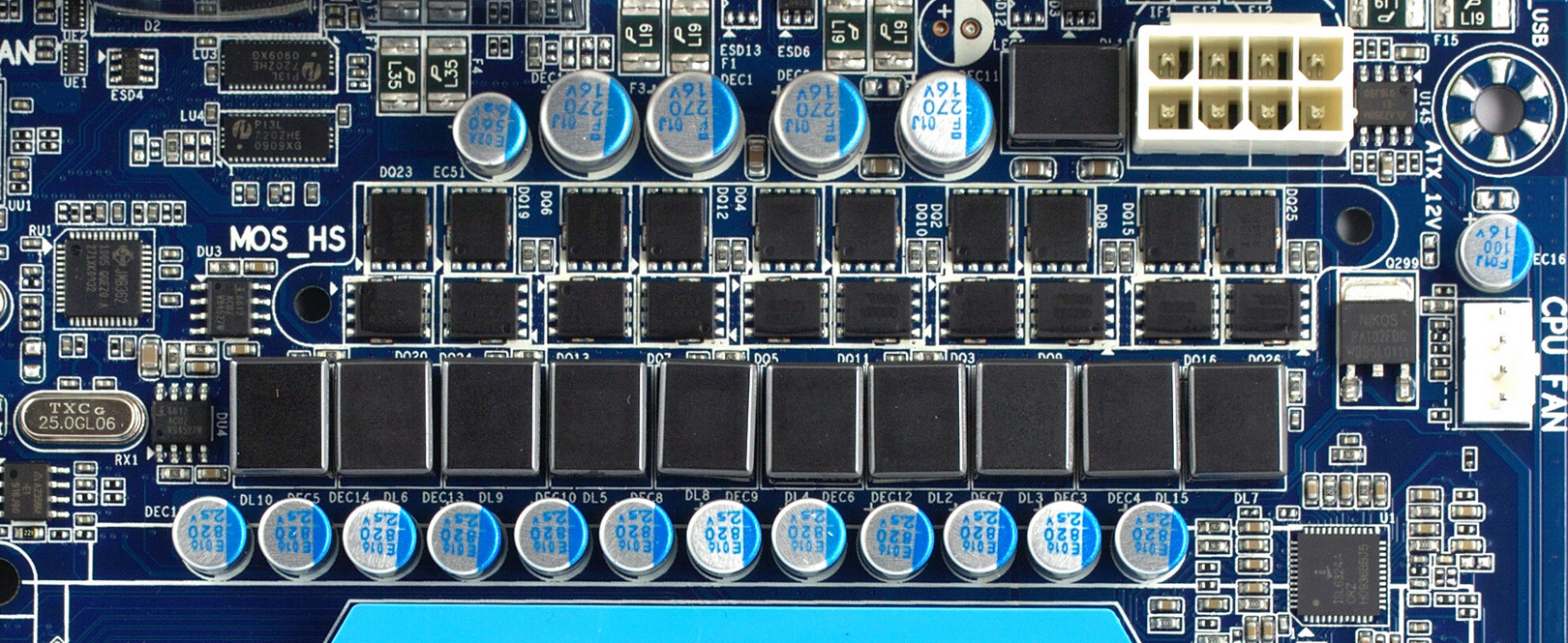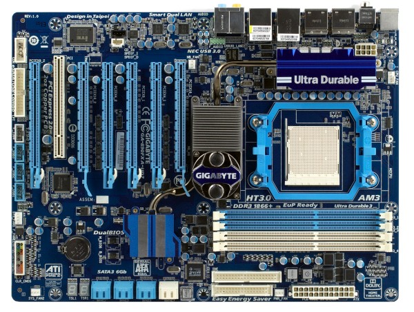 Стабилизатор напряжения питания процессора — 10-канальный, установлено по 2 высокоэффективных полевых транзистора с Low RDS (on) на канал, в качестве дросселей установлены катушки с ферритовыми сердечниками. Установлены 12 конденсаторов по 820 мкФ и 4 — по 270 мкФ, все без исключения конденсаторы на плате от ведущих японских производителей, твердотельные. Плата имеет утолщенные вдвое медные слои питания и заземления. Поддерживаются процессоры с заявленным TDP до 140 Вт. Таким образом, применен стандартный набор элементов для плат Gigabyte, который встречался нам и у моделей среднего уровня, каких-то особых дополнений для повышения статуса мы не наблюдаем. Впрочем, это и не актуально, учитывая, что 6-ядерные процессоры, вопреки ожиданиям, получили не 140 Вт тепловой пакет, а ограничились 125 Вт, да и среди ранее выпускавшихся 140-ваттных топовых четырехъядерников уже произошла смена степпинга. И все ныне поставляемые топовые процессоры от AMD имеют максимальное теоретическое энергопотребление не выше 125 Вт.