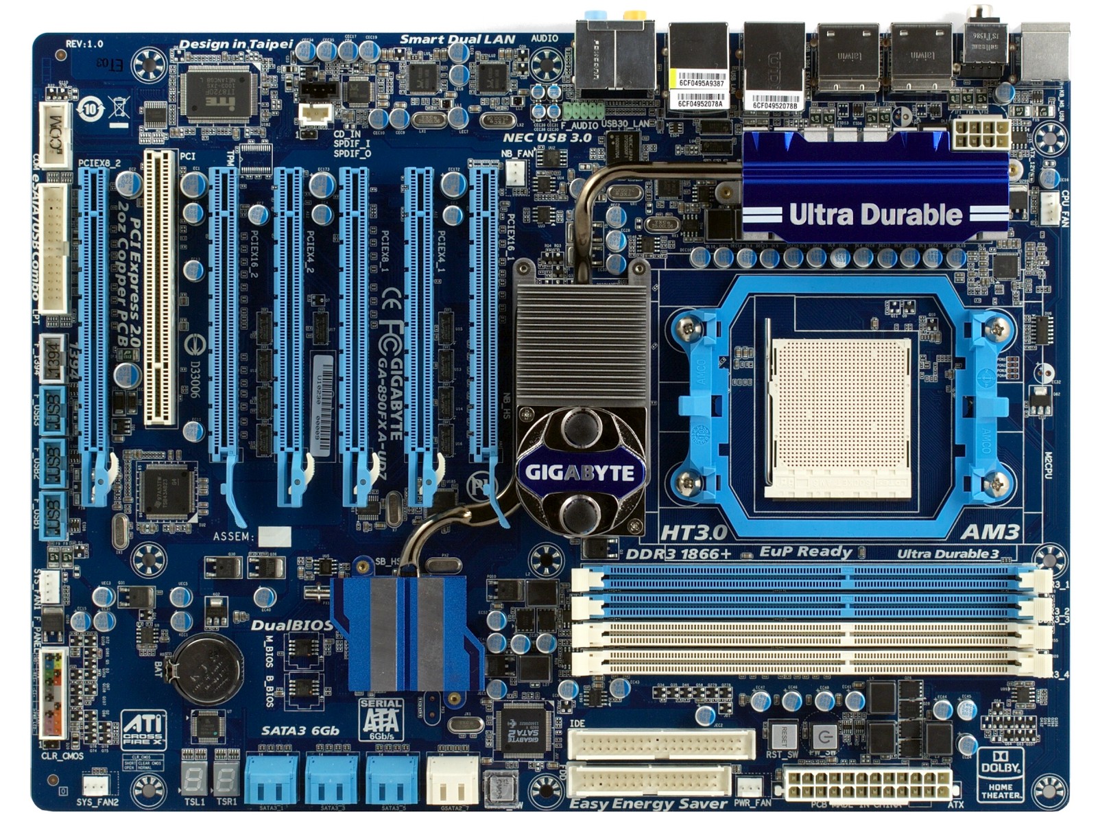 Таким образом, в сравнении с предыдущей связкой 790FX+SB750 новый чипсет получил поддержку SATA 3.0 и вдвое более производительную внутричипсетную шину, которая должна в свою очередь способствовать повышению производительности того же SATA-контроллера (в случае, если пользователь планирует подключить много дисков). Также в составе южного моста появился MAC-адаптер гигабитной сети, но эта опция ценная скорее для бюджетных плат, нежели для топовых, поскольку разница в стоимости контроллеров обоих типов на сегодня просто копеечная.