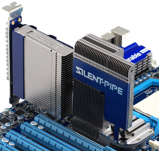 Совершенно очевидно, что энергоемкости такой конструкции должно хватить не только для охлаждения любого чипсета, но и какого-нибудь низковольтного процессора. Поэтому и идеологи бесшумного воздушного охлаждения должны быть довольны. Мы, кстати, устанавливали эту конструкцию лишь при проведении тестов в разгоне процессоров, все остальное время плата работала с не подключенным водяным теплообменником, то есть в наиболее жестком режиме. И именно в таком режиме готовились тесты шестиядерного процессора, то есть вместе с прогоном процессоров, использовавшихся для сравнения, это эквивалентно работе в круглосуточном режиме под нагрузкой близкой к максимальной в течении недели. К этому надо добавить, что корпус вентилятора процессорного кулера, использовавшегося в данном случае (Cooler Master Hyper Z600) нависал прямо над основным радиатором чипсета, и в результате не только практически не способствовал охлаждению, но и в какой-то мере затруднял конвекцию. Температура радиатора на чипсете в таком режиме составляла около 45 градусов и никаких признаков сбоев за время тестов не обнаружилось. Словом, импровизированный нагрузочный тест можно считать пройденным. Ну а установка внешней конструкции предсказуемо опускает температуру этого узла до температуры окружающей среды, так что с практической точки зрения оставлять ее в коробке, конечно же, не стоит, пусть служит.