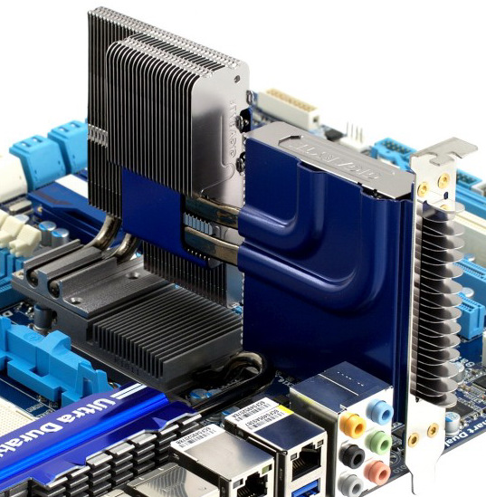 Словом, основное, что удерживает производителей от установки штатных жидкостных теплообменников, это тот факт, что даже среди энтузиастов балуются водяным охлаждением далеко не все, а явное меньшинство. И остальному большинству в таком случае будет обидно, ведь пустой теплообменник не только не работает, но и мешает охлаждению, ведь он содержит воздух, являющийся своего рода изолятором. Для того чтобы большинство тоже было довольно, разработчики из Gigabyte предлагают самостоятельно заменить теплообменник на вот такую конструкцию в форме карты расширения, прилагающуюся к плате.