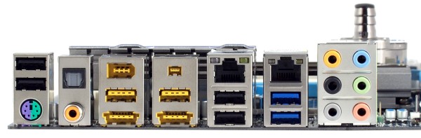 Комплектация полная, как и подобает топовой модели. Объективно сложно пожелать что-то еще, имеются, в частности, два сетевых порта, обе разновидности FireWire-портов, а также оба типа S/PDIF-выходов для подключения цифрового аудиоресивера. Есть пара eSATA (но в данном случае стандарта 2.0, поскольку реализуются за счет внешнего контроллера), причем совмещенные с USB, что постепенно входит в моду. И, наконец, логично дополняют картину два USB 3.0, помеченные синим цветом.