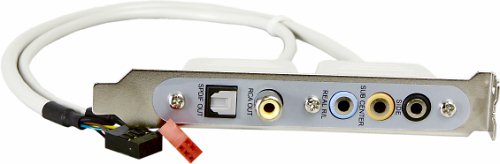 - Планка на заднюю панель компьютера с 3 аналоговыми аудиоразъемами (Side, Sub/Center, Rear), а также оптическим (Toslink) и коаксиальным разъемами S/PDIF-Out (подключение происходит к разъему на плате, который предназначен в том числе для входа S/PDIF, но в данном комплекте поставки эта возможность не реализуется);