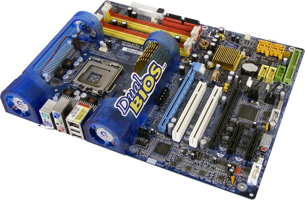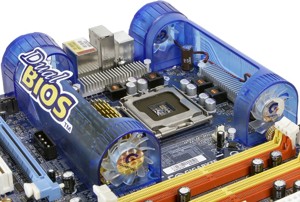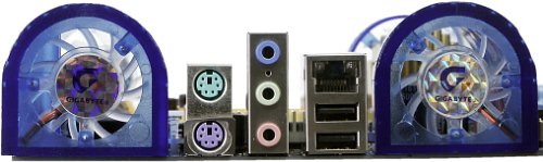 Действительно, у таких плат ABIT блок преобразователя питания был забран в пластиковый кожух, а благодаря его разводке получавшийся воздуховод «обтекал» процессорный сокет. При этом конвекция воздуха в нем задавалась не только кулером на процессоре, но и двумя вентиляторами, установленными на задней панели. Охлаждение модулей памяти и северного (наиболее горячего) моста чипсета производилось силами отдельных устройств — вентилятором на радиаторе чипсета и сложной конструкцией с двумя вентиляторами, монтируемой над слотами DIMM, с упором на их защелки. Нельзя не признать, что Gigabyte удалось построить более завершенную систему. Итак, инженеры компании расположили на плате две «аэродинамические трубы», в торцах которых установлено по 40-миллиметровому вентилятору. При этом концам труб-воздуховодов, выходящим на заднюю панель, была придана характерная внешность турбины реактивного самолета, что оправдывает название технологии (Turbojet).