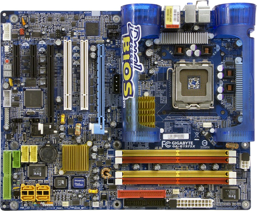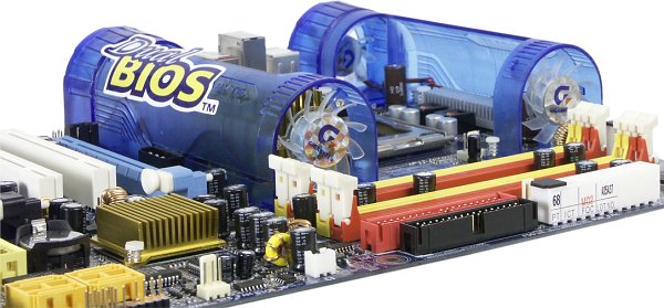 Однако плата интересна не только интерфейсами для подключения периферии. В дополнение к проверенной временем и отлично себя зарекомендовавшей технологии DualBIOS на G1975X впервые (для продукции Gigabyte) применены табло с аппаратной индикацией POST-кодов (что позволяет легко найти причину, по которой плата не стартует) и кнопки для включения системы, а также для перезагрузки, причем нажатие на последнюю заодно приводит к сбросу CMOS. Воистину, продуманный и удобный в работе набор средств для сборщика, особенно для увлекающегося разгоном. За все вышеперечисленные особенности (включая, но не ограничиваясь, интеграцией Sound Blaster Live! 24-bit) плата Gigabyte G1975X заслуживает награды нашего сайта за оригинальный дизайн.