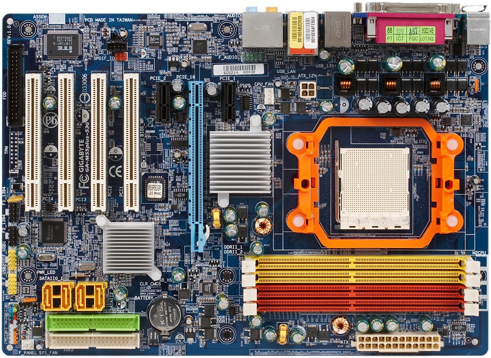 В трехканальном импульсном стабилизаторе напряжения питания процессора применены по 4 полевых транзистора на канал, 5 конденсаторов по 3300 мкФ от Rubycon и 3 по 1500 мкФ от Sanyo, стабилизатор напряжения питания памяти усилен применением индуктивных элементов и укомплектован конденсаторами от Sanyo. Похвалы заслуживает и внушительное общее количество полевых транзисторов и, конечно же, выбор поставщиков конденсаторов. На плате имеется разводка для разъема TPM, пока еще крайне редко встречающегося в распаянном виде. Модельный ряд Gigabyte включает две модели на чипсете GeForce 6100 + nForce 430, помимо рассматриваемой, существует M51GM-S2G, но поскольку она выполнена в стандартном для «интегрированных» плат формате Micro-ATX, разводка ее отлична от рассматриваемой нами платы. Размер платы — 305×213 мм («укороченный» ATX), крепление к корпусу 7 винтами, два угла «повисают» в воздухе, однако, их можно зафиксировать от прогиба с помощью распорных «грибков» через имеющиеся отверстия.