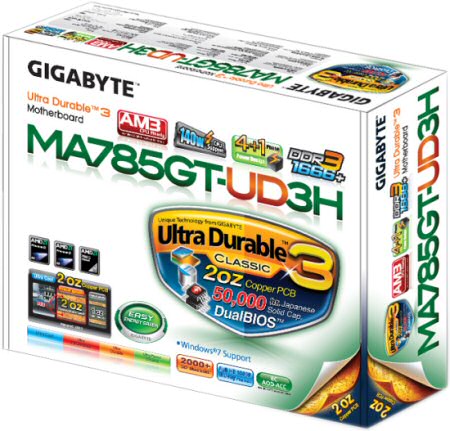 Компания Gigabyte выпустила в свет целый выводок плат на 785G, но в основном, это, конечно, microATX-платы, тем не менее у рассматриваемой в этом обзоре есть почти полная копия, выполненная на том же дизайне, но с поддержкой DDR2 — MA785G-UD3H. Соответственно, те, кто считают переход на DDR3 преждевременным ни коим образом к этому шагу не принуждаются.