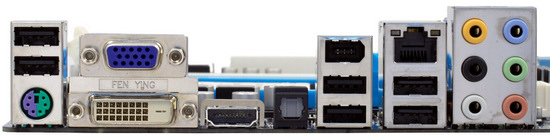 Выбор «готовых к использованию» портов на задней панели достаточно привлекательный: есть и полный набор видеовыходов, и FireWire, и оптический S/PDIF Out, а 6 портов USB расположены просторно и допускают подключение устройств с относительно широкими штекерами. Жаль лишь, что забытым оказался eSATA-порт. Подчас совершенно не ясно: для чего производители плат искусственно ограничивают привлекательность своих разработок, ведь вывести один из чипсетных портов на заднюю панель очень просто и дешево, а для пользователя это выглядит однозначным преимуществом, даже если он не собирается обзаводится устройством с таким интерфейсом прямо сейчас.
