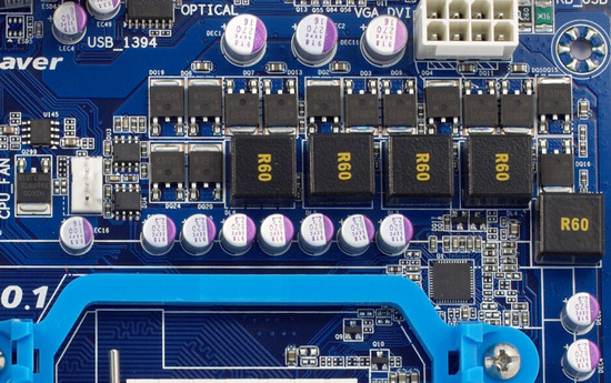 В пятиканальном стабилизаторе напряжения установлено по 3 полевых транзистора в 4 каналах, питающих процессорные ядра и 2 — в канале, ответственном за питание CPU NB. Суффикс UD в названии соответствует, как обычно, платам с «особо долговечными» cхемами питания. В данном случае пользователь получает твердотельные конденсаторы ведущих японских производителей в количестве 9 штук по 820 мкФ и 3 — по 270 мкФ и утолщенные вдвое медные слои питания и заземления. Поддерживаются процессоры с заявленным TDP до 140 Вт.