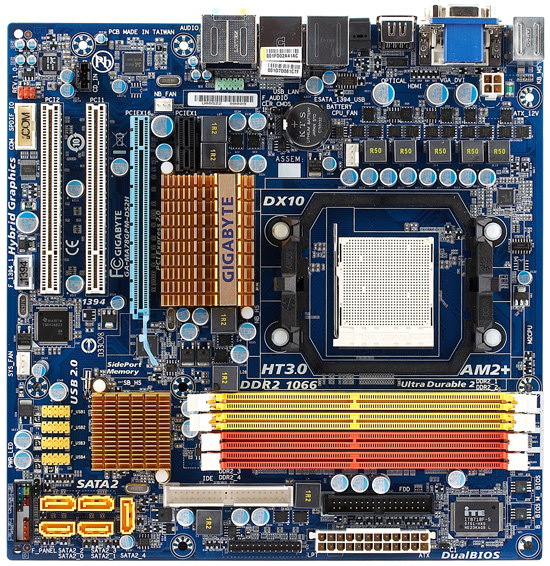 Очевидно, успех модели MA78GM-S2H, с функциональностью, претендующей на универсальное применение, но тем не менее, имеющей формат microATX, сподвиг инженеров Gigabyte на еще более смелый эксперимент — сделать на основе упомянутой платы еще более оснащенную модель. И если реализация видеобуфера, вероятно, не очень сильно повышает себестоимость, то учитывая усиление стабилизатора напряжения, в целом, плата получилась дороже. Тем не менее, мы почти уверены, что пользователи не обойдут вниманием и эту модель, в оригинальности дизайна которой вряд ли кто усомнится.