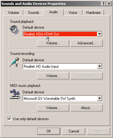 Кстати, если вы хотите, чтобы по HDMI передавался лишь аудиопоток в фильмах, а все остальное шло через аналоговые (и цифровые S/PDIF) выходы основного аудиокодека на плате, выберите в Windows в качестве устройства по умолчанию Realtek HD Audio, а собственно HDA HDMI Out определите в качестве устройства воспроизведения только в видеоплеере (хотя, к сожалению, далеко не все плееры это позволяют).