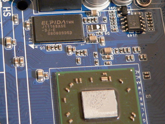 А вот и собственно микросхема памяти от Elpida объемом 128 МБ стандарта DDR3-1333, впрочем, в BIOS по умолчанию установлена частота 533 МГц (DDR3-1066), а штатная (для чипа) доступна в разгоне. Характерно, что несмотря на расположение под общим радиатором с чипом северного моста, сама память не контактирует с радиатором, а отдает тепло печатной плате. Нагрев в штатном режиме невелик, однако для любителей разгона, создание контакта чипа памяти с радиатором будет естественной процедурой.