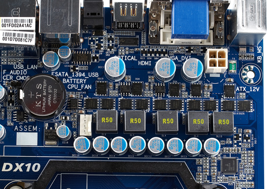 Существенно по сравнению с MA78GM-S2H усилен стабилизатор питания для процессора, 5 каналов имеют по 3 полевых транзистора (причем недешевых, с пониженным сопротивлением Low RDS(on)), что на компактной плате встречается очень редко, применены 8 конденсаторов по 820 мкФ и 3 по 470 мкФ, все конденсаторы на плате фирменные твердотельные, катушки тоже не простые, а с ферритовыми сердечниками и, разумеется, имеют корпусное исполнение, поэтому плата под нагрузкой бесшумна.