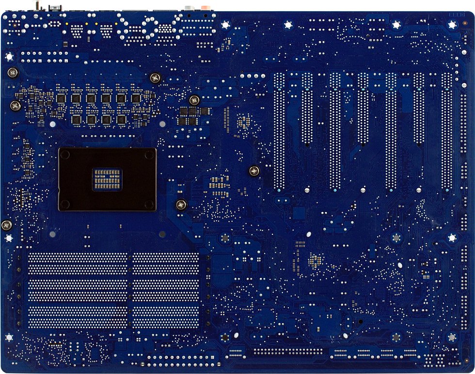 Даже если вы умудритесь не обратить внимания на габариты коробки, в которой X58A-UD9 продается, при первом же взгляде на текстолит станет понятно, что плата просто огромна — 345×262 мм (стандартный ATX — 305×244 мм), что соответствует форм-фактору XL-ATX. Само собой, эта модель влезет не в каждый корпус, и более того — на текущий момент в списке совместимых корпусов значится всего 6 уникальных моделей (5 производителей). Любопытно, что продукция собственно Gigabyte в этом списке отсутствует ;). Корпус должен поддерживать до 9 карт расширения (если предполагать, что владелец все 4 карты захочет установить двухслотовые, с габаритной системой охлаждения), потому что слоты расширения сдвинуты на один относительно крепежа ATX, чтобы позволить еще закрепить на задней стенке большой радиатор, входящий в гибридную систему охлаждения чипсета.